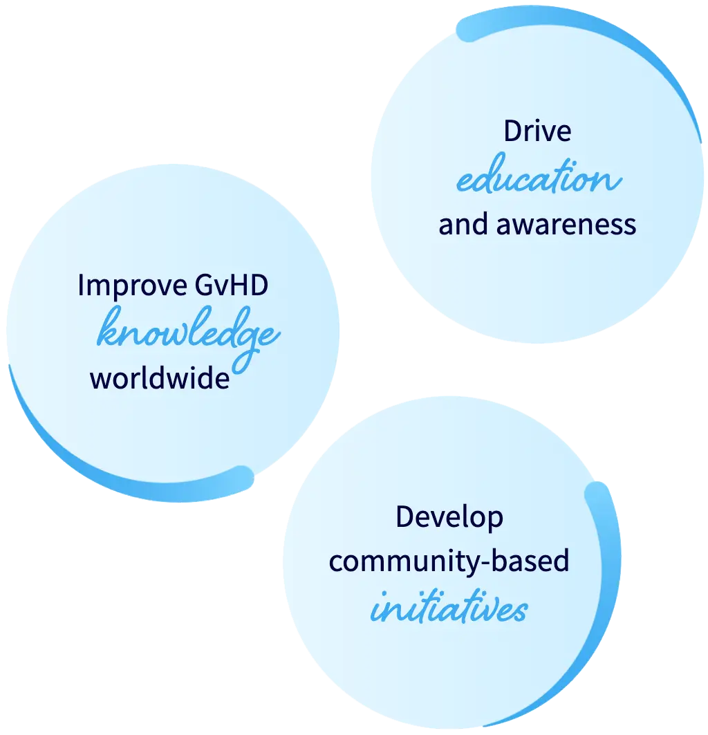Our vision is to aspire to facilitate and improve graft-versus-host disease (GvHD) knowledge worldwide and develop community-based initiatives to overcome current and future challenges. Our mission is to drive education and awareness of GvHD globally through community collaborations, while continuing to raise awareness of the resources and support currently available.